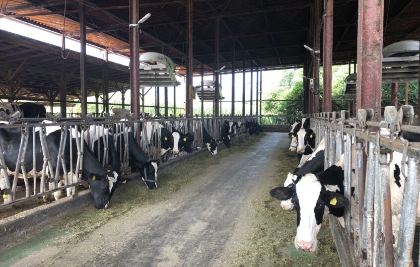 石山牧場の令和6年度生乳出荷量は544tで、牛群検定による経産牛1頭当たりの年間平均産乳量は9684㎏と、牛群飼養管理に努められています。また、乳成分においても乳脂肪率4.11%、無脂固形分率8.83%、乳質では体細胞数30万、細菌数3万と安定した良質乳を生産されています。